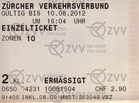 Galerie Tarifverbünde Schweiz 24/24 Zürcher Verkehrsverbund: Einzelbillett des Zürcher Verkehrsverbund ZVV für eine Zone auf eigenem Papier mit Logo. Die Zonennummern waren damals noch zweistellig.